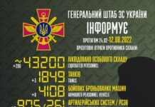 უკრაინის შეიარაღებული ძალების გენერალური შტაბი რუსი ოკუპანტების სამხედრო დანაკარგის შესახებ განახლებულ ინფორმაციას ავრცელებს. მონაცემები მოიცავს 24 თებერვლიდან 12 აგვისტომდე პერიოდს.