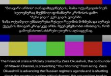 მთავარი არხი გათიშულია. ტაბლოზე ორენოვანი ტექსტი წერია, სადაც ვკითხულობთ: "მთავარი არხის" თანადამფუძნებლის, ზაზა ოქუაშვილის მიერ ხელოვნურად შექმნილი ფინანსური კრიზისის გამო, "შენი დილა" ვერ გადის...